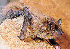 to only a few years. Big brown bat (Eptesicus fuscus) Recognition Color Confusion may occur with the evening bat (Nycticeius humeralis) though the latter is much smaller. Habits E. fuscus frequently shares roosts with M. lucifugus in the East, and with M. yumanensis, Taderida, and Antrozous in the West. Males typically roost in smaller groups or alone during the summer. The big brown bat is one of the most widely distributed of bats in the United States and is probably familiar to more people than any other species. This is partially due to its large, easy-to-observe size, but also to its ability to overwinter in buildings (attics, wall spaces, and basements). Its close proximity to humans, coupled with its tendency to move about when temperature shifts occur, often brings this bat into human living quarters and basements in summer and winter. Big browns also hibernate in caves, mines, storm sewers, burial vaults, and other underground harborage. While E. fuscus will apparently travel as far as 150 miles (241 km) to hibernacula, the winter quarters of the bulk of this species are largely unknown. Big brown bats may live as long as 18 years. Mexican free-tailed bat (Tadarida