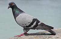 The feral pigeon is generally blue-gray with a white rump; has iridescent